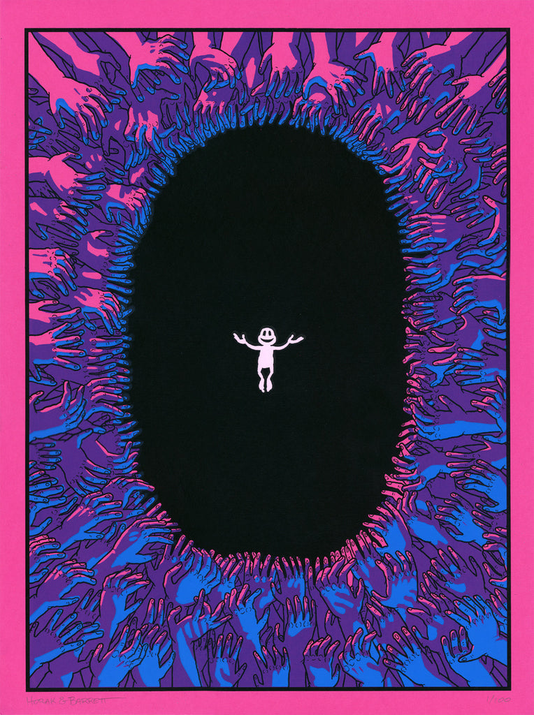 The indispensable art piece for the discerning dorm, attic, or drug den resident. Ben Horak & Pat Barrett teamed up to draw this piece for their first collaborative comic, Thanks for the Sour Persimmons, Cousin! Hand printed by Flying Saucer Press in Brooklyn, these big, pink beauties are sized for a standard poster frame. A limited edition of 100, signed and numbered.
