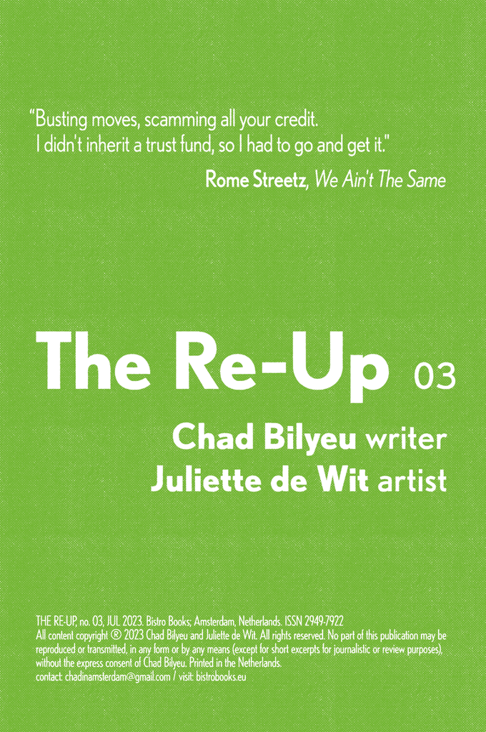 Before he was known as “Chad in Amsterdam”, Chad Bilyeu spent a decade in Washington, DC where he lived many lives. Most notably he worked at and graduated from Georgetown University. However, unbeknownst to most he also sold copious amounts of drugs there. The Re-up #3" By Chad Bilyeu & Juliette de Wit