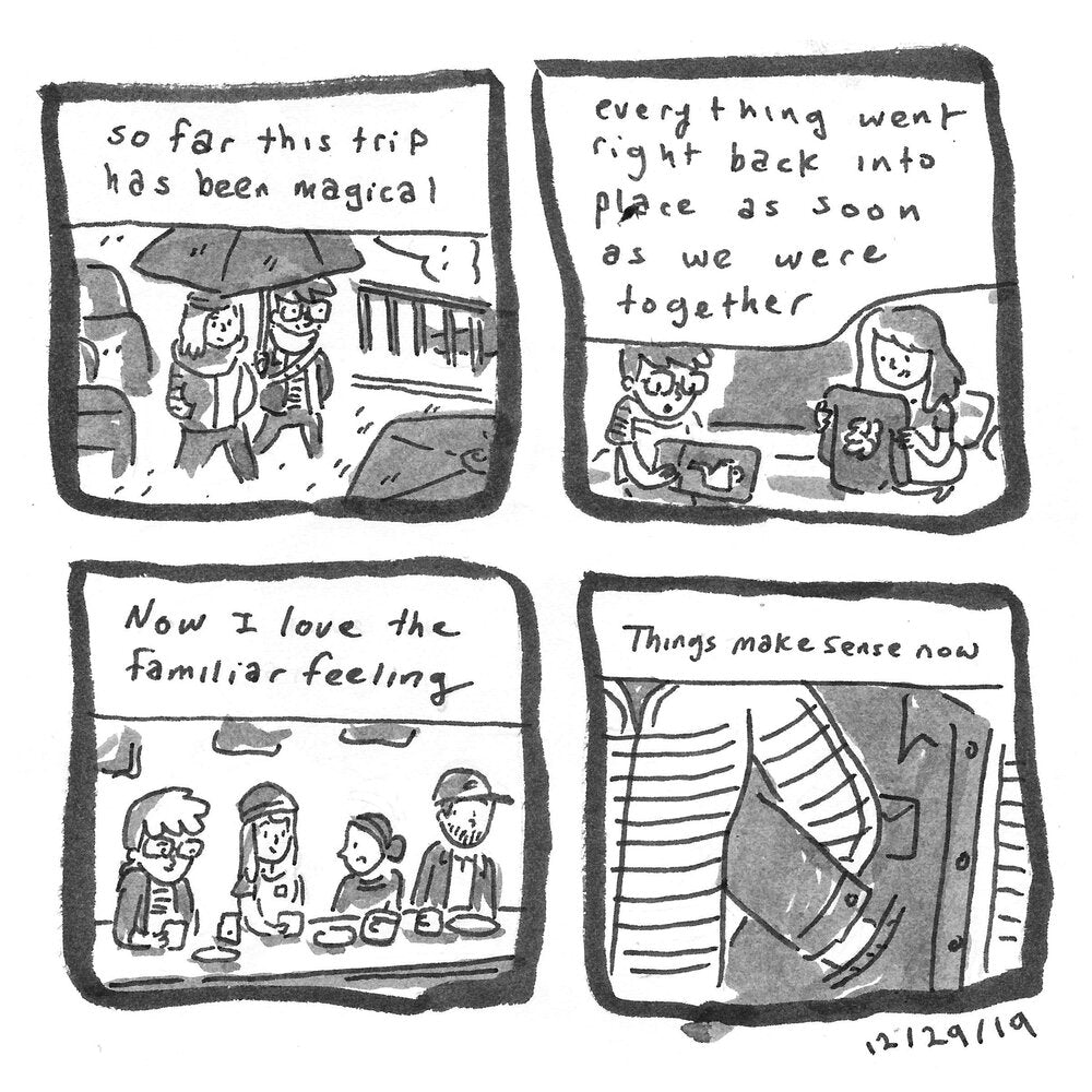 Diary comics from December 2019. Printed February 2020 for patreon. Cross country trips to Comic Arts Los Angeles and New York City. Deepening a new relationship and spending time with old friends. New Years 2020.