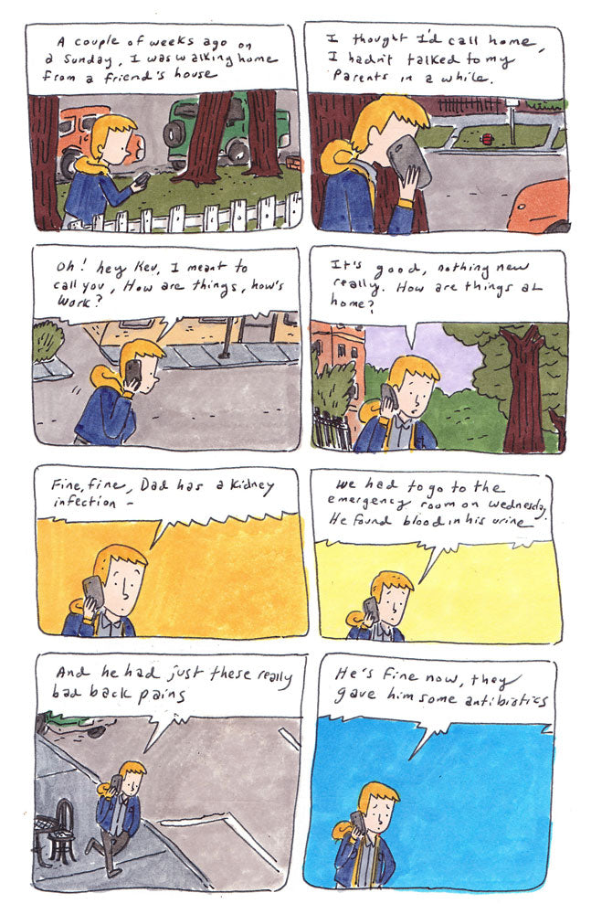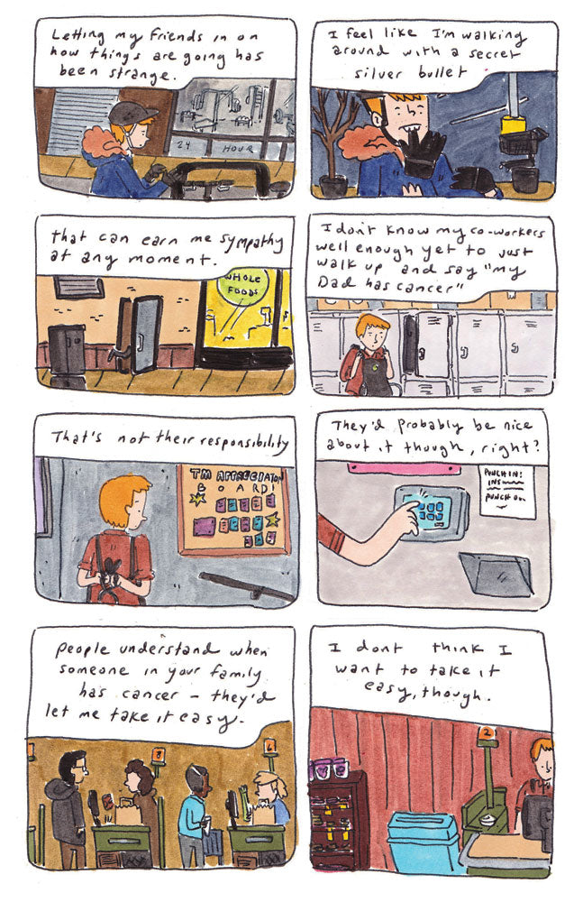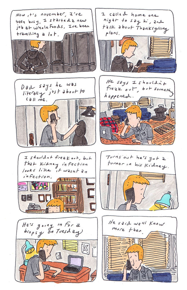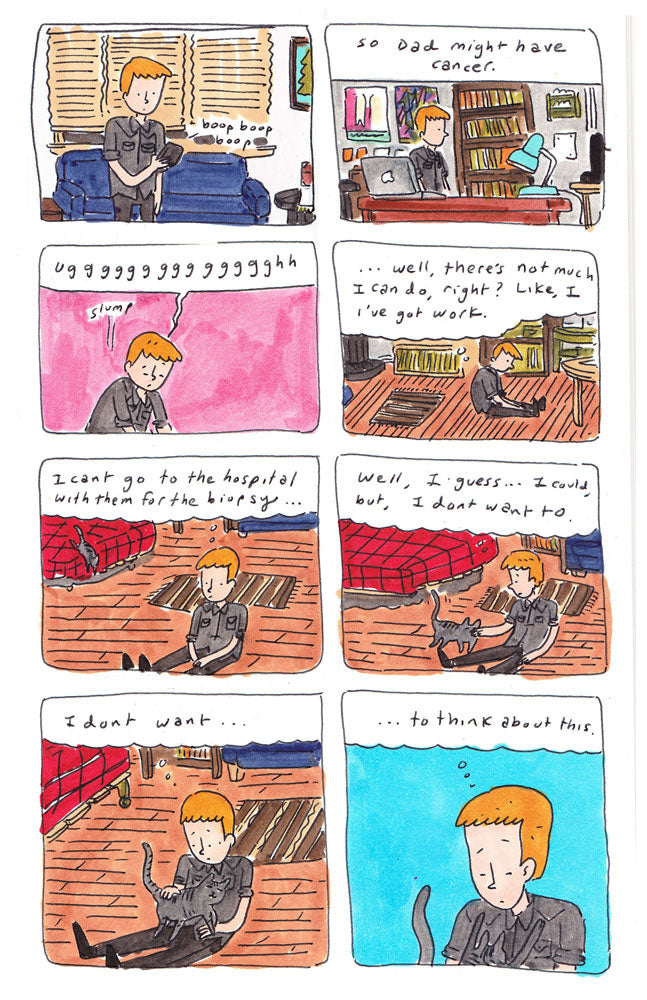 "One Thing At A Time, Bud" starts with the news of his father's hospitalization for what turns out to be cancer. Budnik admits that drawing diary comics helps him process emotions, so the reader is privy to his internal dialogue, childhood reminiscence and conversations with family as he struggles to cope with a scary reality.
