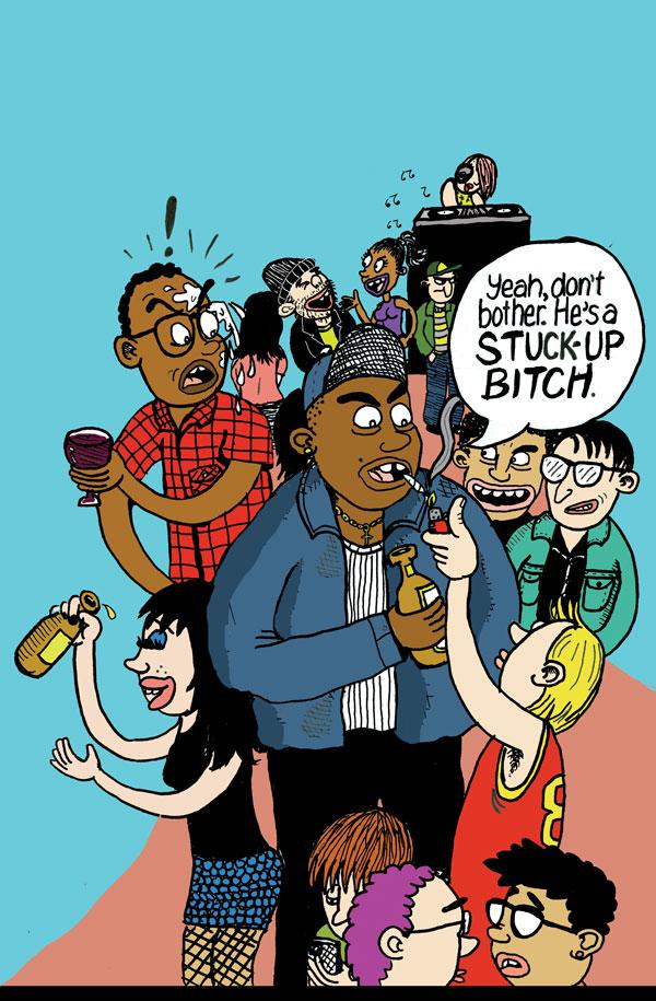 Each story is accompanied by a full-color illustration by Bay Area cartoonist Janelle Hessig. From shrooming at the bathhouse to a handjob on public transportation, Hessig’s loose and lively drawings are the perfect narrative complement, adding an extra layer of comedy, just when you thought you were tapped out.