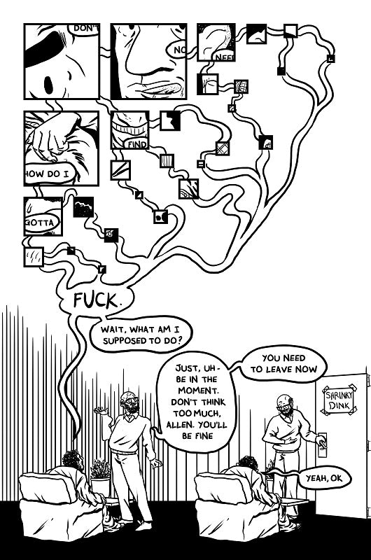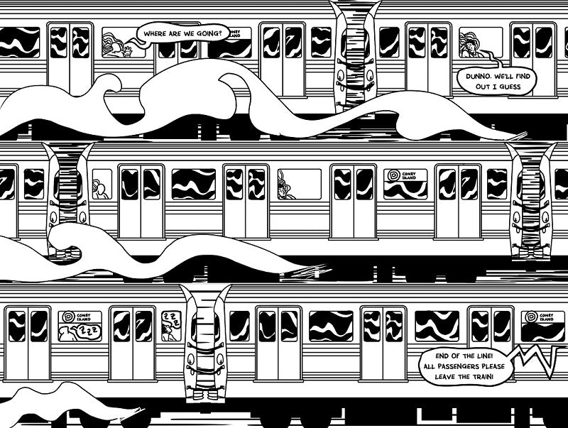 Novelty is a book of journeys, long and short: across New York from Manhattan to Coney Island, through therapy, and most importantly through two different manifestations of the mind. It tells the story of Allen, a young man who is sometimes himself, and sometimes a blank figure, a stark humanoid whose expressive rendering on the page is a reminder of the disconnect between the body and the mind. Allen attempts to follow his therapist’s advice and to ‘be in the moment’ with varying degrees of success, and eventually finds peace with himself and learns what it means to be fulfilled. Mohar Kalra’s flowing linework makes for an accessible and surprisingly uplifting story, in which we can all see ourselves and our sense of self.