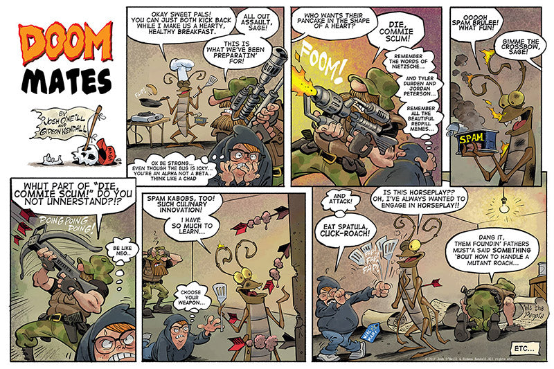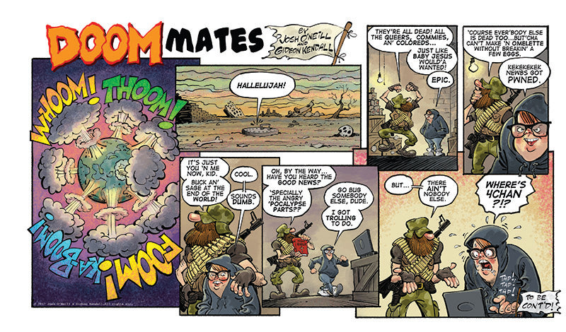 Buck is a rootin’ tootin’ Bible-thumpin’ racist/sexist/everythingist doomsday prepper. Sage is an egomaniacal neckbearded nihilist 4Chan troll fresh out of his mother’s basement. Sealed together in Buck’s well-stocked apocalypse bunker, they’ll have to ride out the end of days with nothing but each other and an overly friendly giant cockroach for company.