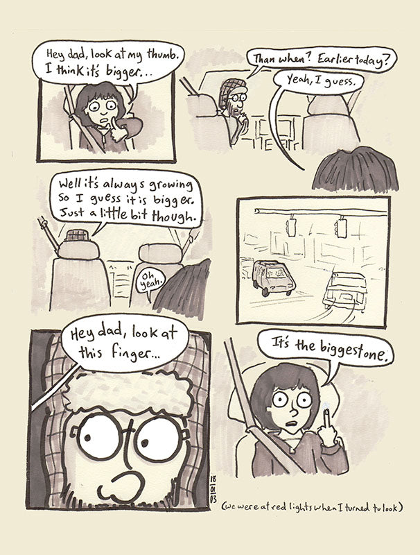 This is the fifth installment of Chris Monday's often autobiographical series of comics. True to the nature of the series it starts of with comics from life usually featuring situations with family. In addition to the journal comics there are pages of sketchbook art and comic one-offs, Utensil Valley comics (jokes about silverware), Hard Opinions on some overlooked issues, and the experience of a 14 year old Chris Monday seeing the music video for Sir Mix-A-Lot's "Baby Got Back" for the first time.