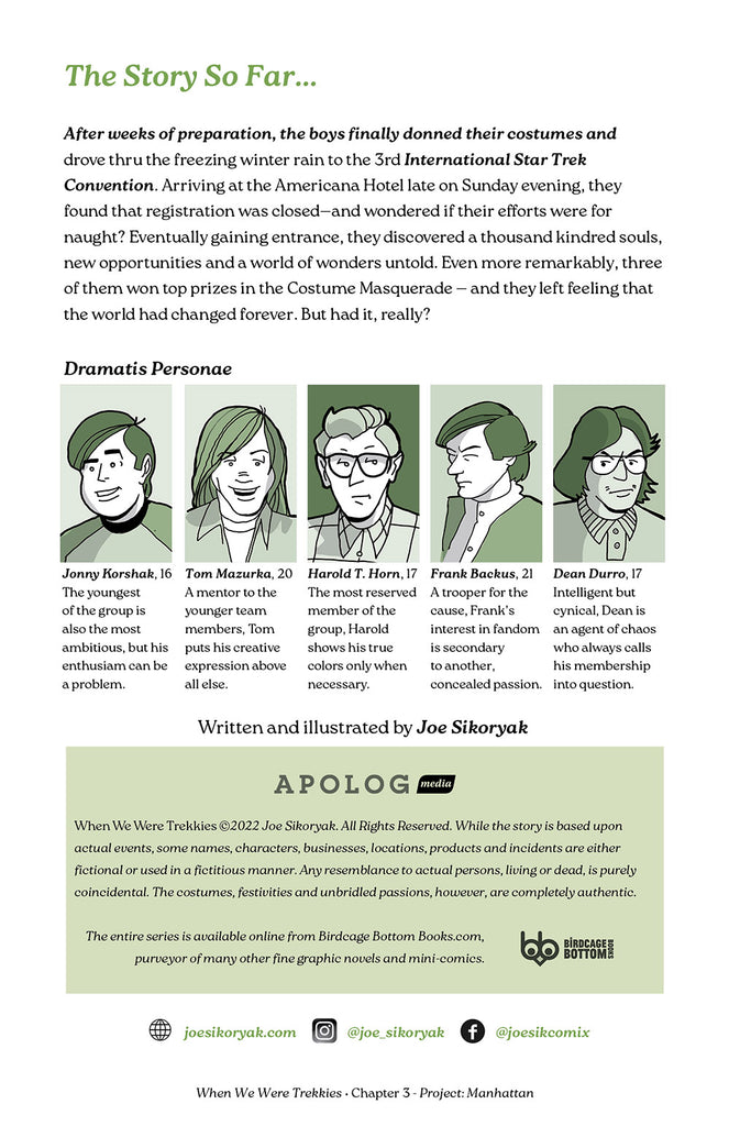 When We Were Trekkies is created by Joe Sikoryak, whose experiences at the first Star Trek, Famous Monsters and Comic Art conventions are the basis of this series. The story he tells blends awkward adolescence, nerdish spectacle and a generous spirit of adventure. While certain details are fictionalized, the costumes, festivities and unbridled passions are completely authentic.