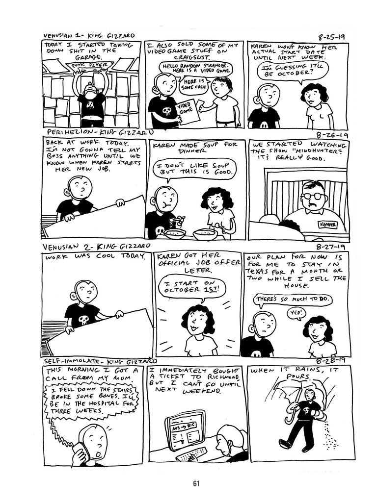 "It’s a relentless diary comic with a casual style. It should be corny (he loves his partner), but it’s sincere. It should be depressing (friends die, elections, covid), but it’s optimistic. It should be full of anxiety (moving from Austin to San Francisco, health issues, theft), but it maintains an optimism that is genuine. Reading this book is like hanging out with a friend you feel lucky to have." – Shannon Wheeler (Cartoonist, New Yorker Magazine and Too Much Coffee Man)
