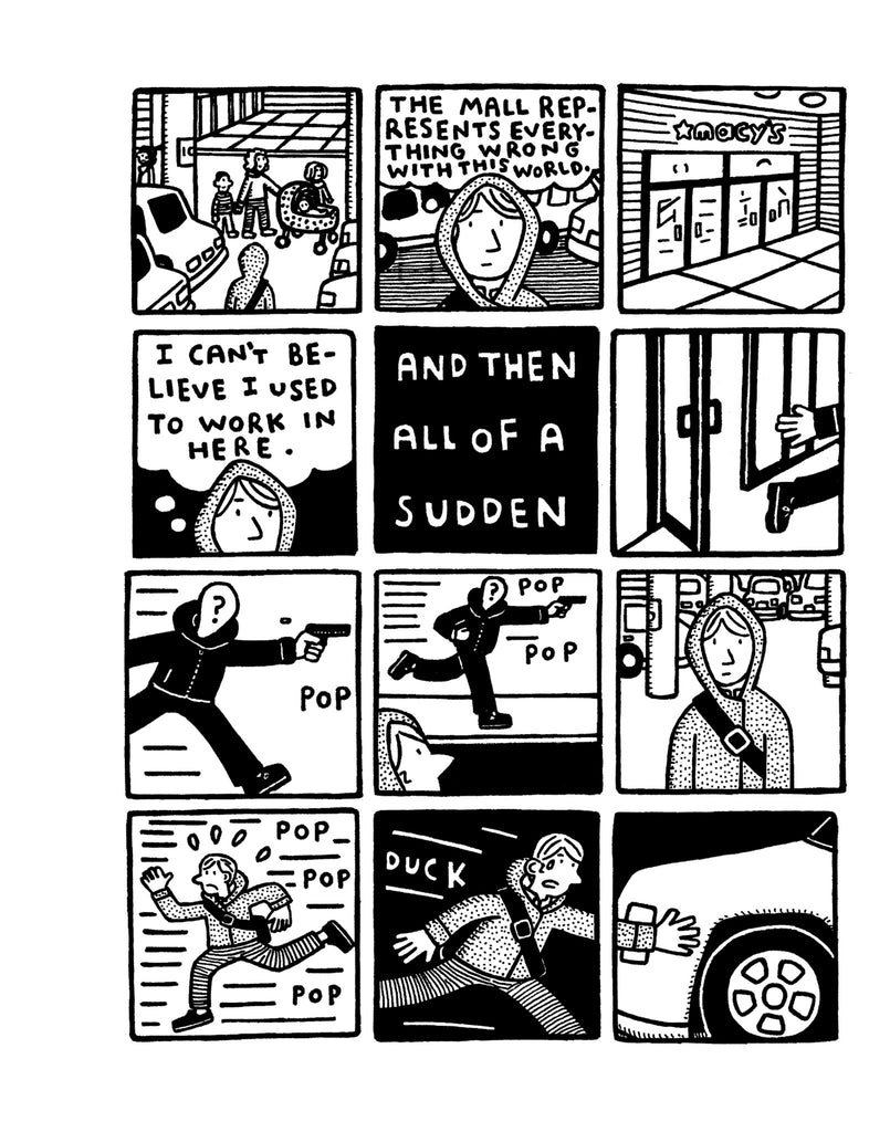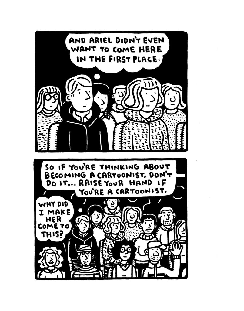 “…Sometimes there is a six panel grid, sometimes four panels per spread, sometimes the spread is one big panel. All are smooth transitions. Aron is someone who is very, very comfortable with the way that he sets up his “reveals” and his punchlines and gags. This is excellent cartooning. Excellent cartooning that is well written.” Frank Santoro, The Comics Journal