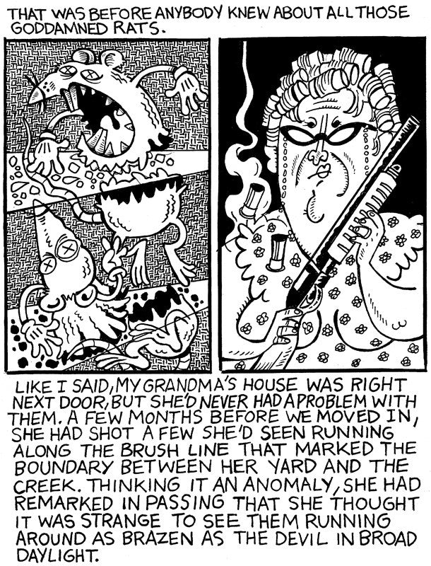 "The Rats Were Bad That Year" is a chapbook written by Alan King and illustrated by Jamie Vayda. TRWBTY details Alan's early experiences with a nauseating rat infestation in the Deep South.
