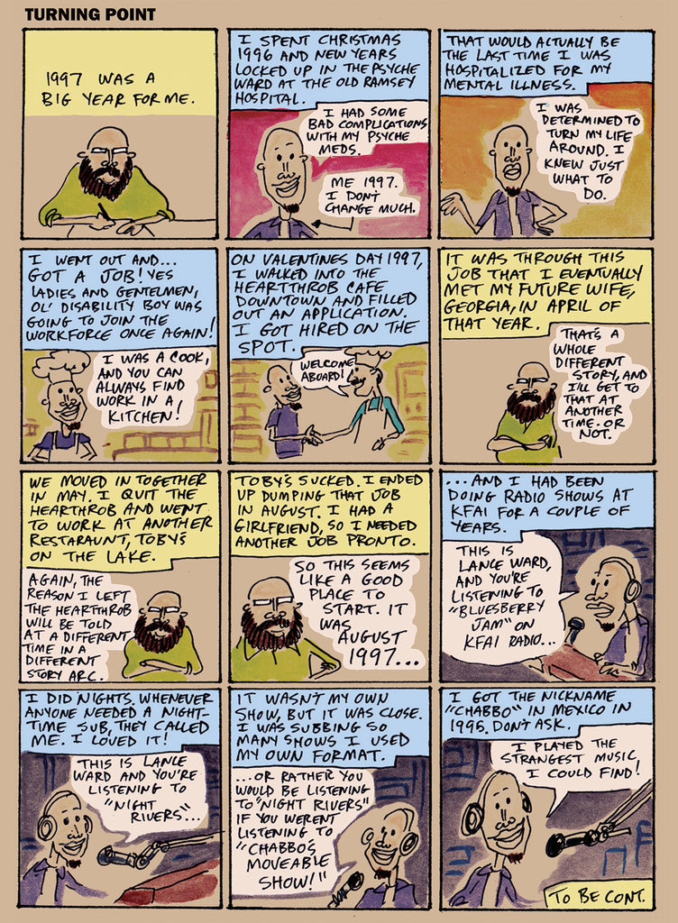 In issue #7: After fulfilling his psychiatric commitment, securing his first apartment, and dealing with memory loss due to mental illness, Lance finds himself in the employ of an ex-rock star and lands a gig as a radio show co-host!