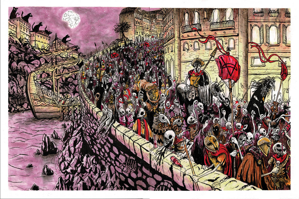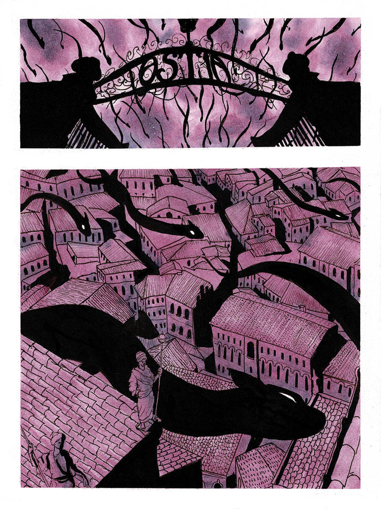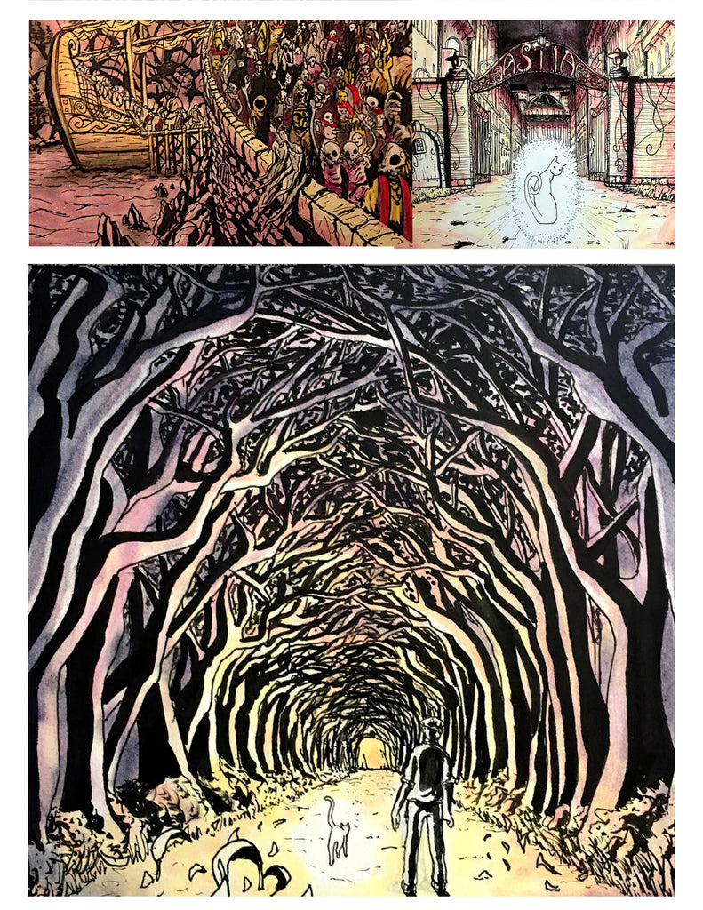 An old Italian fellow is startled awake to an eerie new reality. Is this a dream? Follow along on his fantastic journey which builds in grandeur with every panel. Escorted by the cats that were part of his everyday life, the man stumbles along in confusion and awe of his new surroundings. Where is he headed? What is the final destination? This comic happens silently; no word balloons or captions yet it manages to tell the story with extreme clarity and with an ever-increasing mystery and richness. It’s 110 pages of full-color spectacle.
