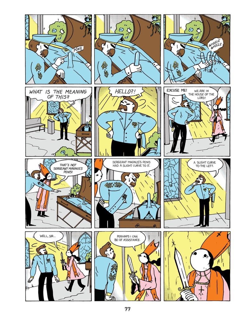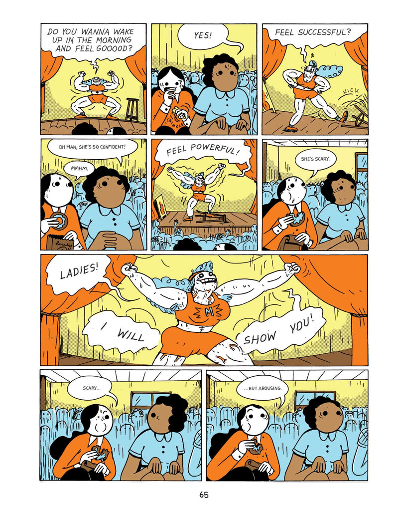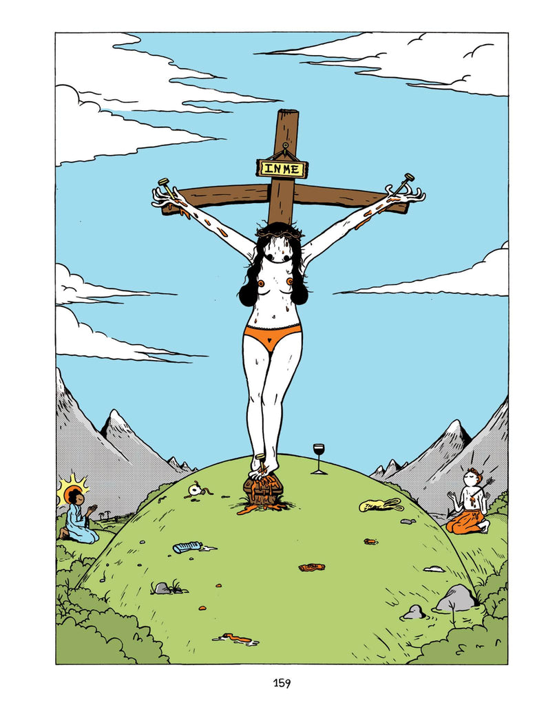 Pich’s cartoonish art is simple and quirky, with clean lines and bold colors. The art transforms potentially graphic scenes of sex and violence into adorably cute, almost sweet, vignettes. Pich renders Fungirl’s particular messiness deliciously palatable, like an inappropriate wedding cake.