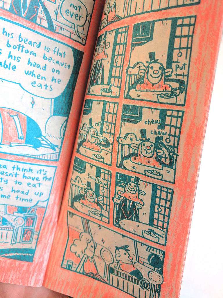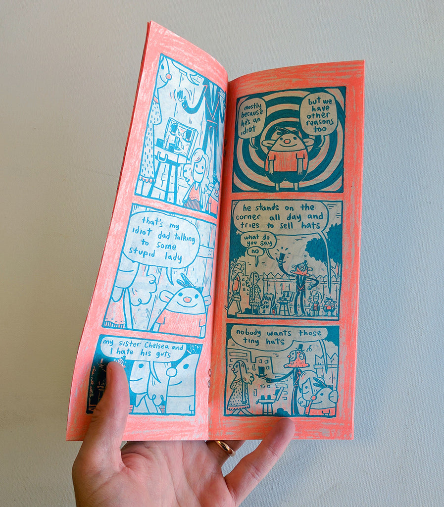 Meet Poppy Dudus and his family in My Dumb Kids; a self published and tall riso printed two tone comic coming in at a smooooth 16 pages. Wow, what a funny, funny book, just wow, really. Could there possibly be some hidden truths about the relationship between parents and children? Maybe some Clinton conspiracy theories? Check it out and see 4 yourself.