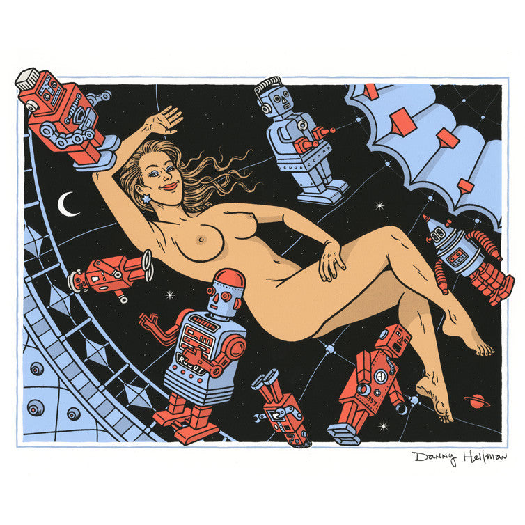 “NUDE WITH TOY ROBOTS” is a must-have for fans of retro cheesecake pin-up art, as well as those who collect vintage toy robots!