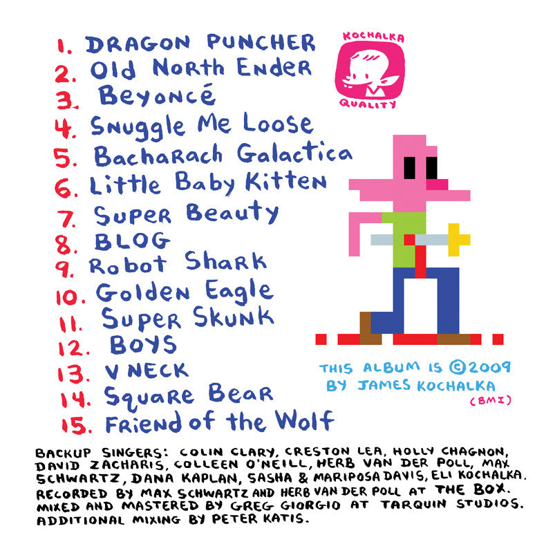 This is Kochalka's only full chiptunes album.  Fifteen catchy songs created on a GameBoy Advance, to give you that old-school video game flavor.  Songs about punching dragons, kittens taking naps, Beynocé, blog wars, a weird lyrical combination of Burt Bacharach and Battlestar Galactica, a love song about v-neck t-shirts, and much more.