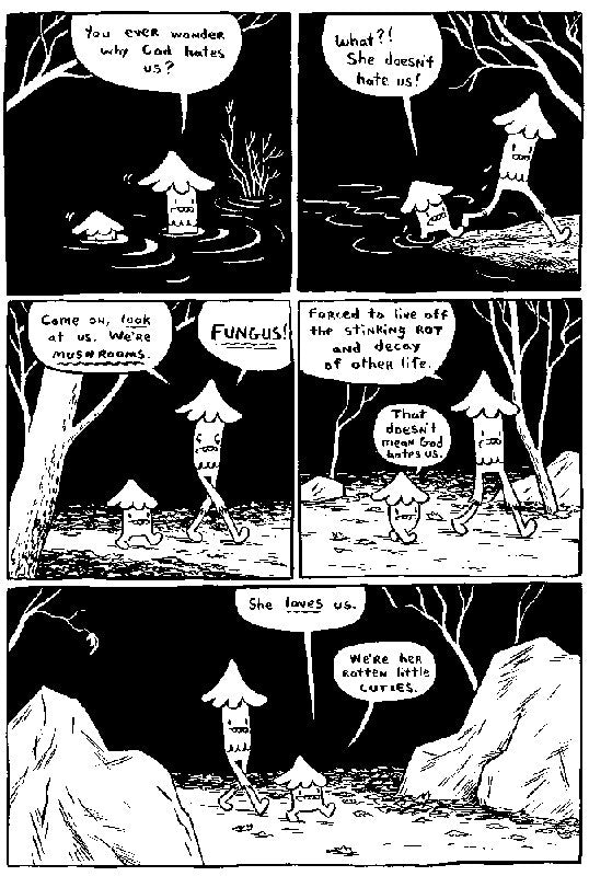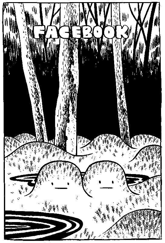 James Kochalka spins tales of mossy pools and the characters that live in them. Two mushroom dudes are looking for an awesome party while discussing the nature of existence, two mossy lumps are convinced they are the true inventors of Facebook but that someone stole it from them, and another fungus is looking for a place where the cell phone reception is rumored to be so good you can actually talk to god.