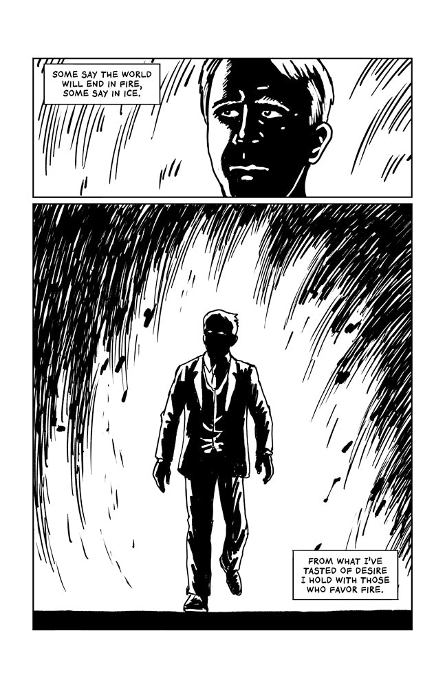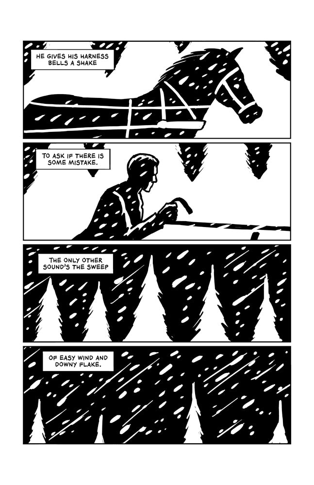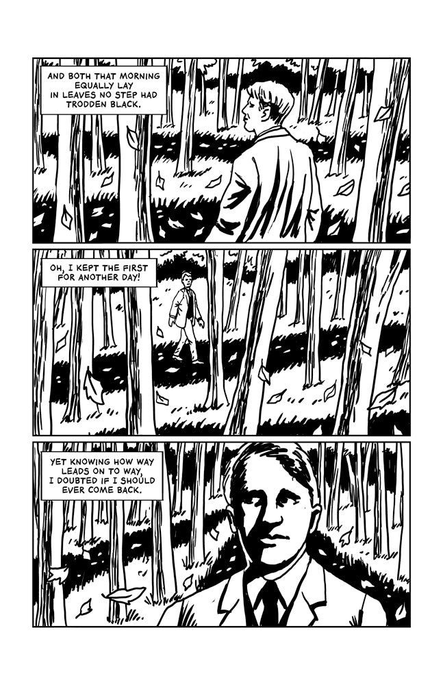 This mini combines the poetry of Robert Frost with the style of 1990’s noir comics like Sin City. A follow-up to the minis “Whitman,” “Poet Poe,” “Catullus the Poet,” “The House of Dickinson,” and “Sappho: Pretty Poet” also drawn by R. Sikoryak, the cartoonist behind Masterpiece Comics, Terms and Conditions, and Constitution Illustrated.