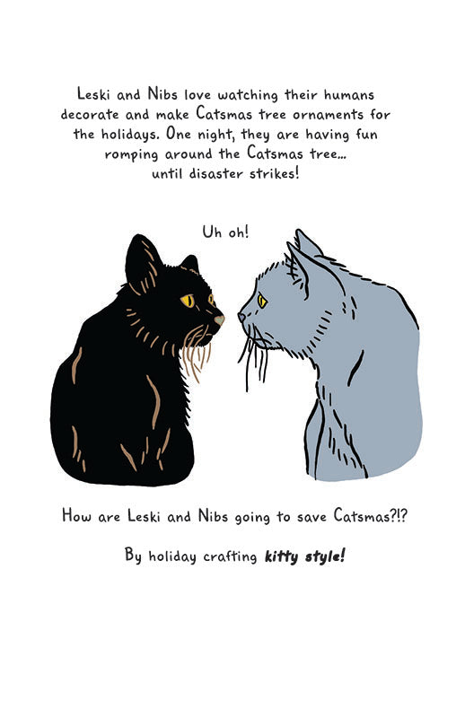 Leski and Nibs love watching their humans decorate and make Catsmas tree ornaments for the holidays. One night, they are having fun romping around the Catsmas tree…until disaster strikes! Uh oh! How are Leski and Nibs going to save Catsmas?!? By holiday crafting…kitty style!