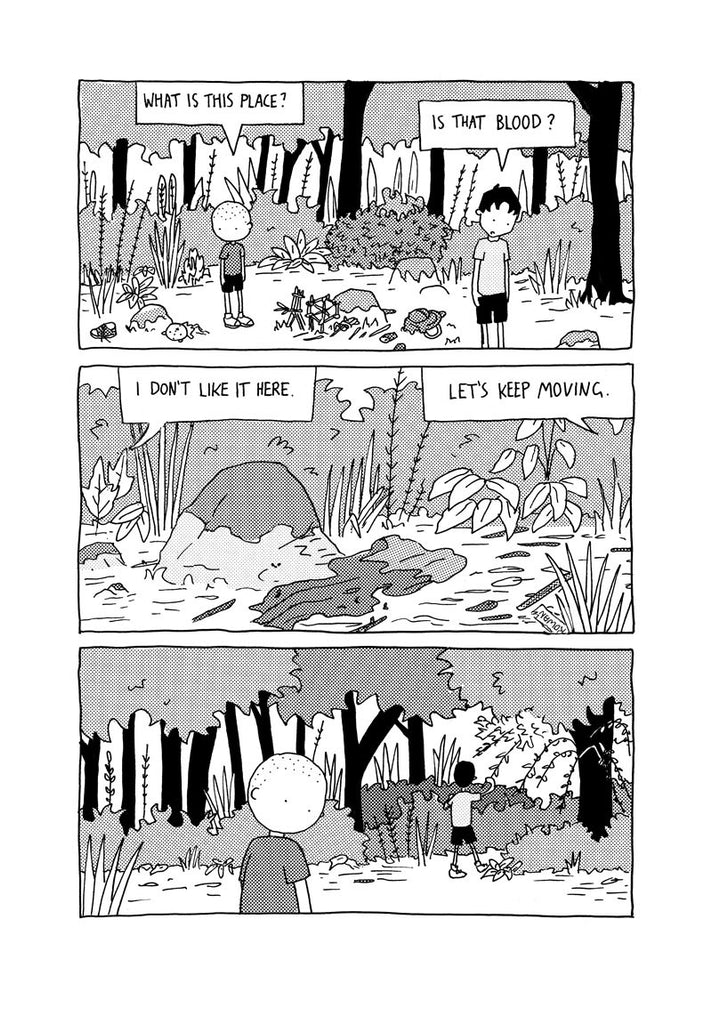 During a school trip, two boys disappear into the woods in search of their friend.
