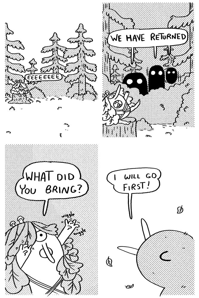 "Bear, Bird and Stag Were Arguing in the Forest (and other stories)" contains the brand new 20 page title story as well as three of Madéleine Flores's popular webcomics: Weave, Soul and Wander.