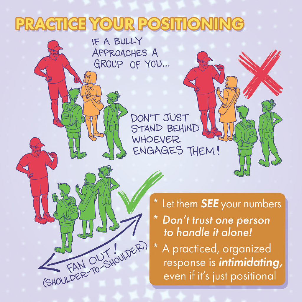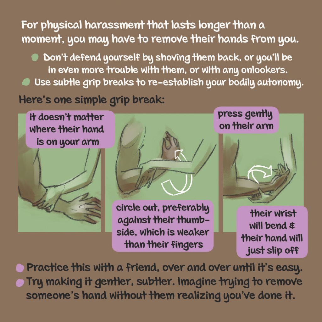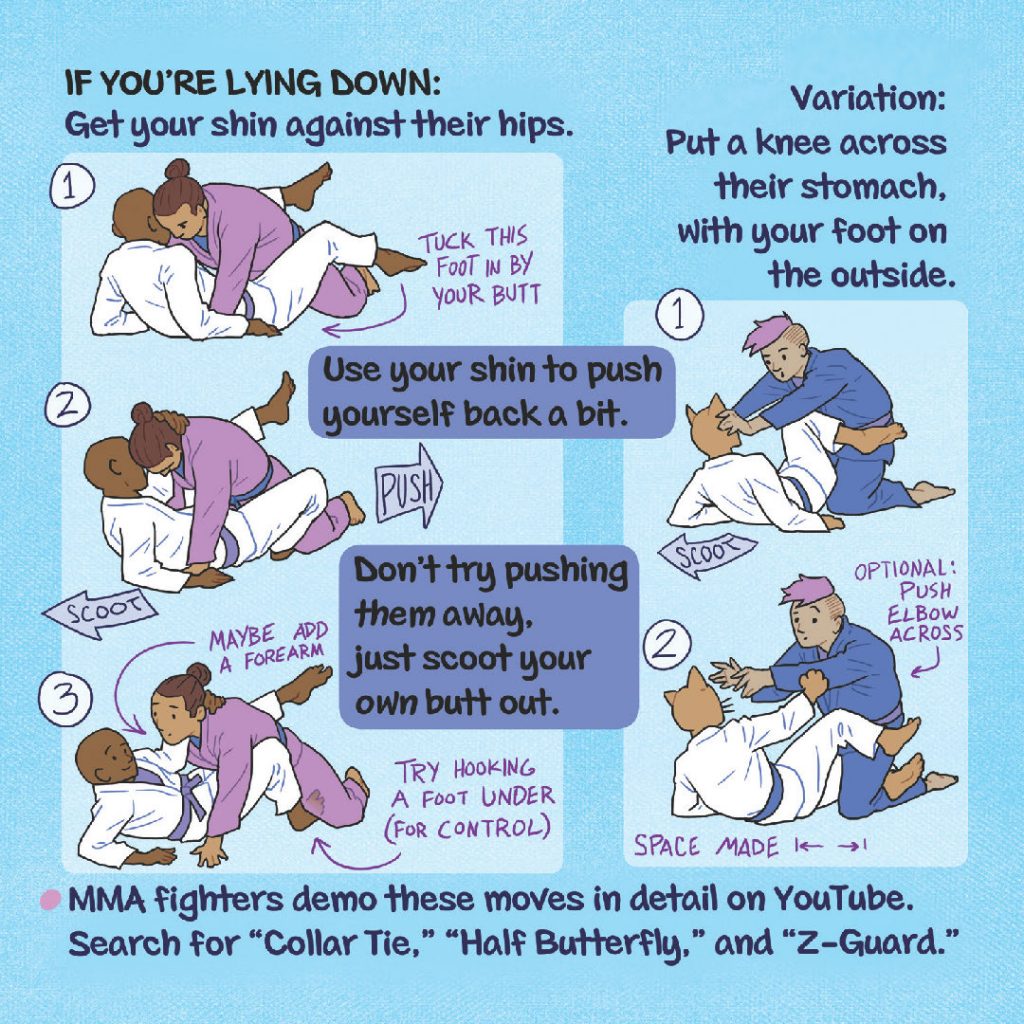 A Self-Defense Study Guide for Trans Women and Gender Non-Conforming / Nonbinary AMAB Folks offers strategies based in lived experience, ranging from using body language and creating safety in numbers, to training Brazilian Jiu-Jitsu moves. The zine includes chapters on how to handle people who have legal or financial power over you, cis women gropers, and menfolk bullies, along with instruction on how to back each other up as a group and how to pause a makeout.