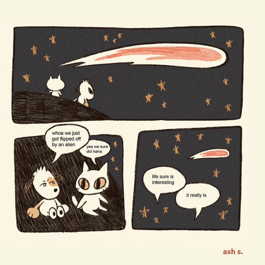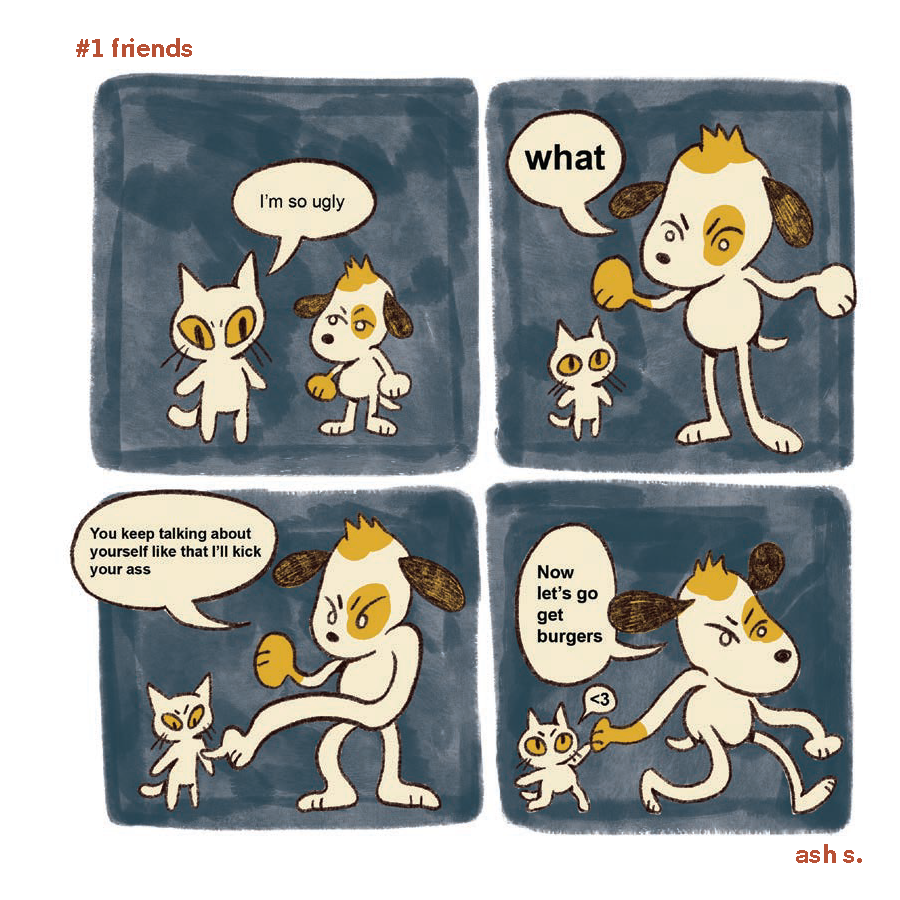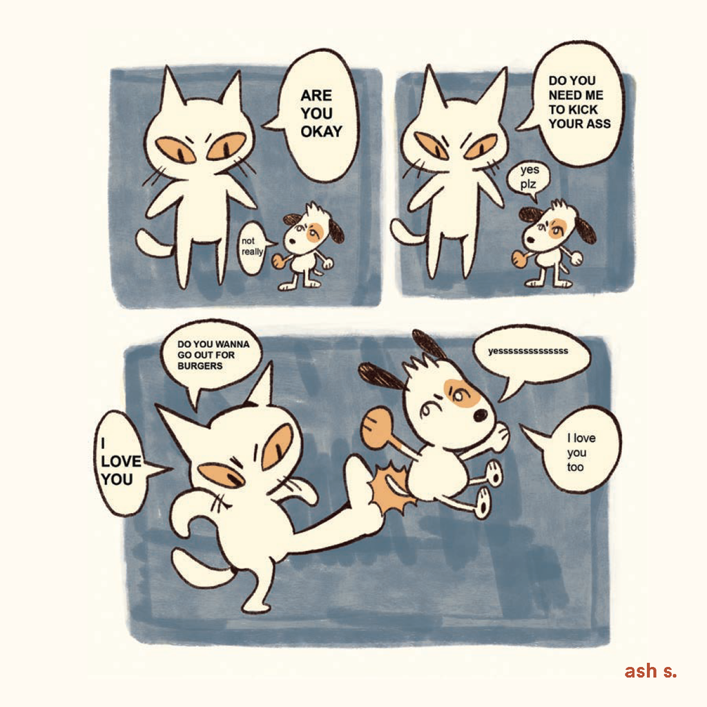 This is a comic about a cat named Knife and a dog named Cheddar who are best friends, love burgers, hate capitalism, and are just trying their best, okay? That’s pretty much it.