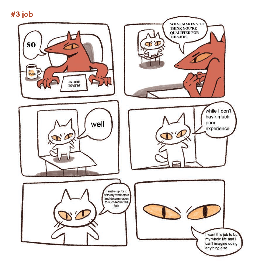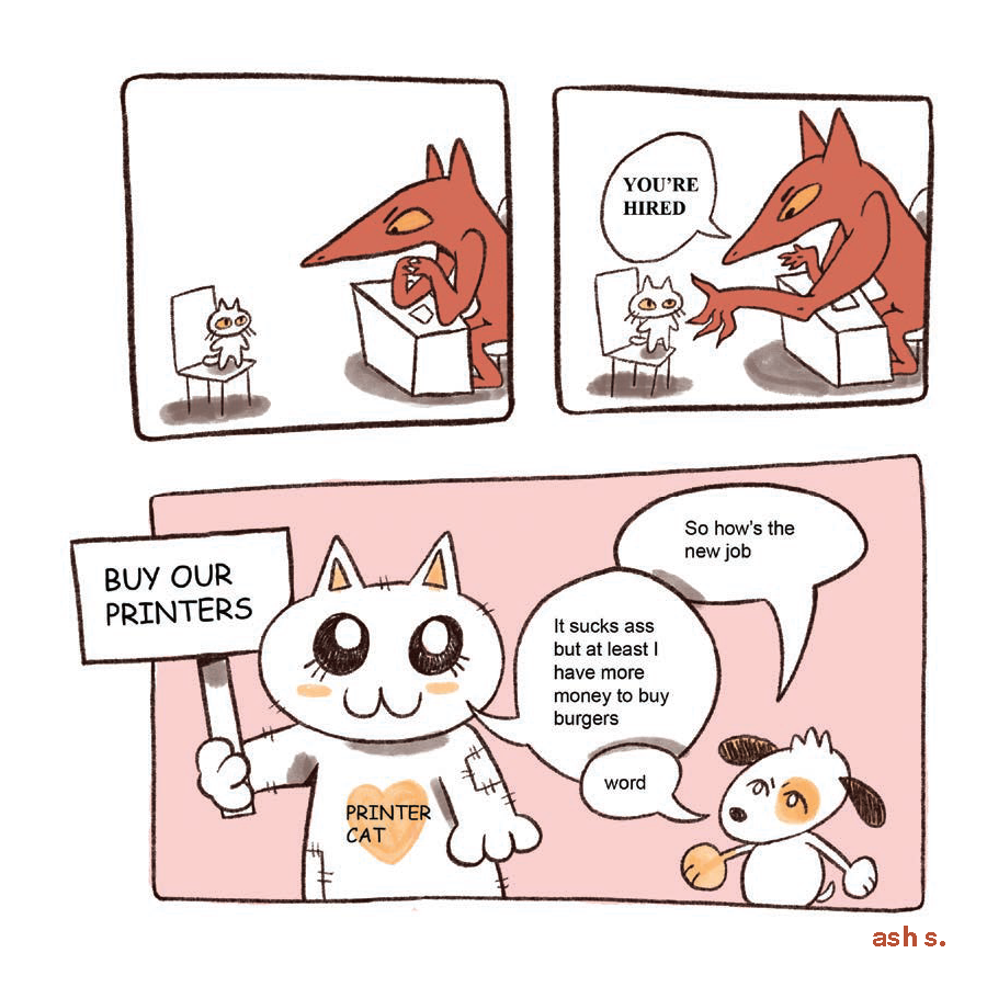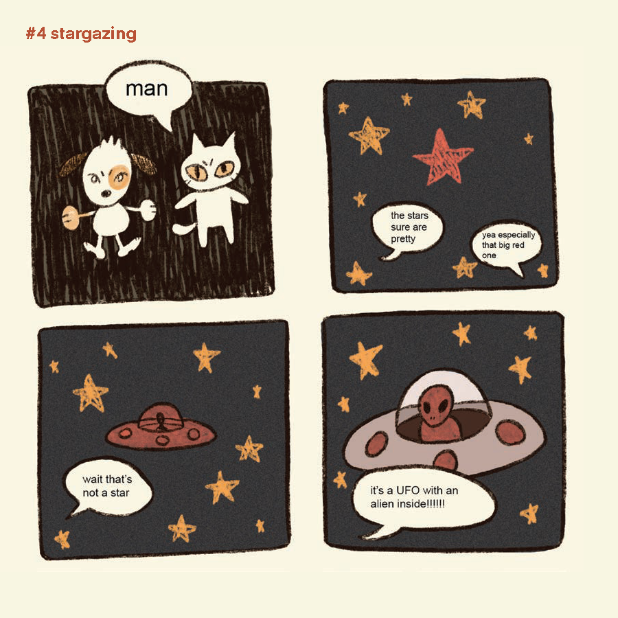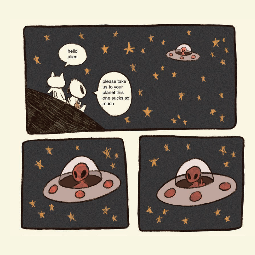 This is a comic about a cat named Knife and a dog named Cheddar who are best friends, love burgers, hate capitalism, and are just trying their best, okay? That’s pretty much it.