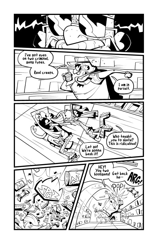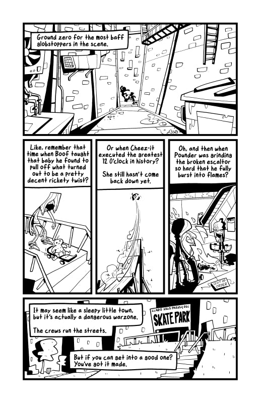 "All three issues approach the skater culture with tongue firmly planted in cheek! The stories are well written, fun, and ridiculously absurd! The art is bold, polished, and full of dynamic action! The overall page designs perfectly match the story pacing and carries the art’s dynamism from panel to panel and issue to issue!