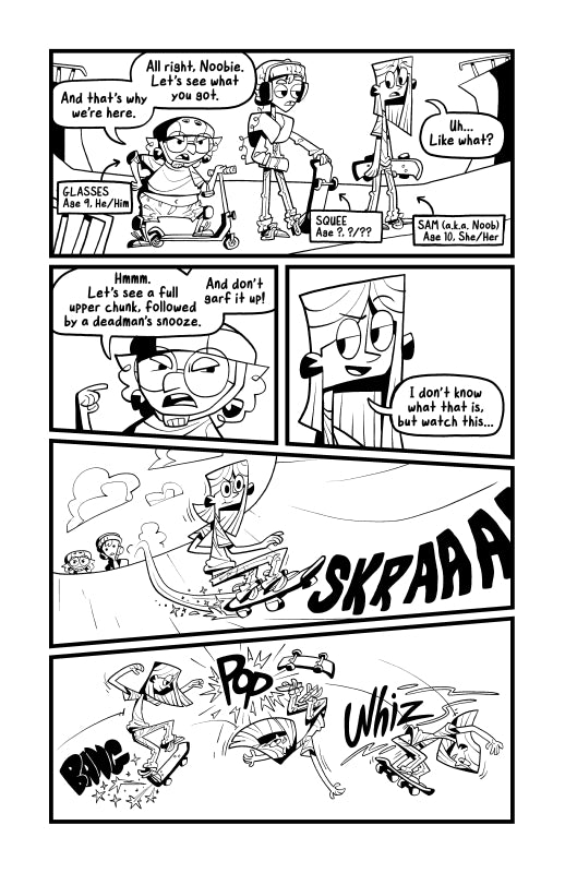 Sam, a noob in the dangerous world of skating, is looking to join a crew for the first time. The only one left to join: A duo of two misfits called Glasses and Squee. Immediately after she is accepted; however, they are expelled from their territory by Radical Tim and the Cool Crew, the most leveled and unimpeachable crew on the streets. Now the team, later joined by Sam’s sister Gearhead, must find a way to level up in order to win back their territory. But something is standing in their way: A security guard from hell known simply as The Law.